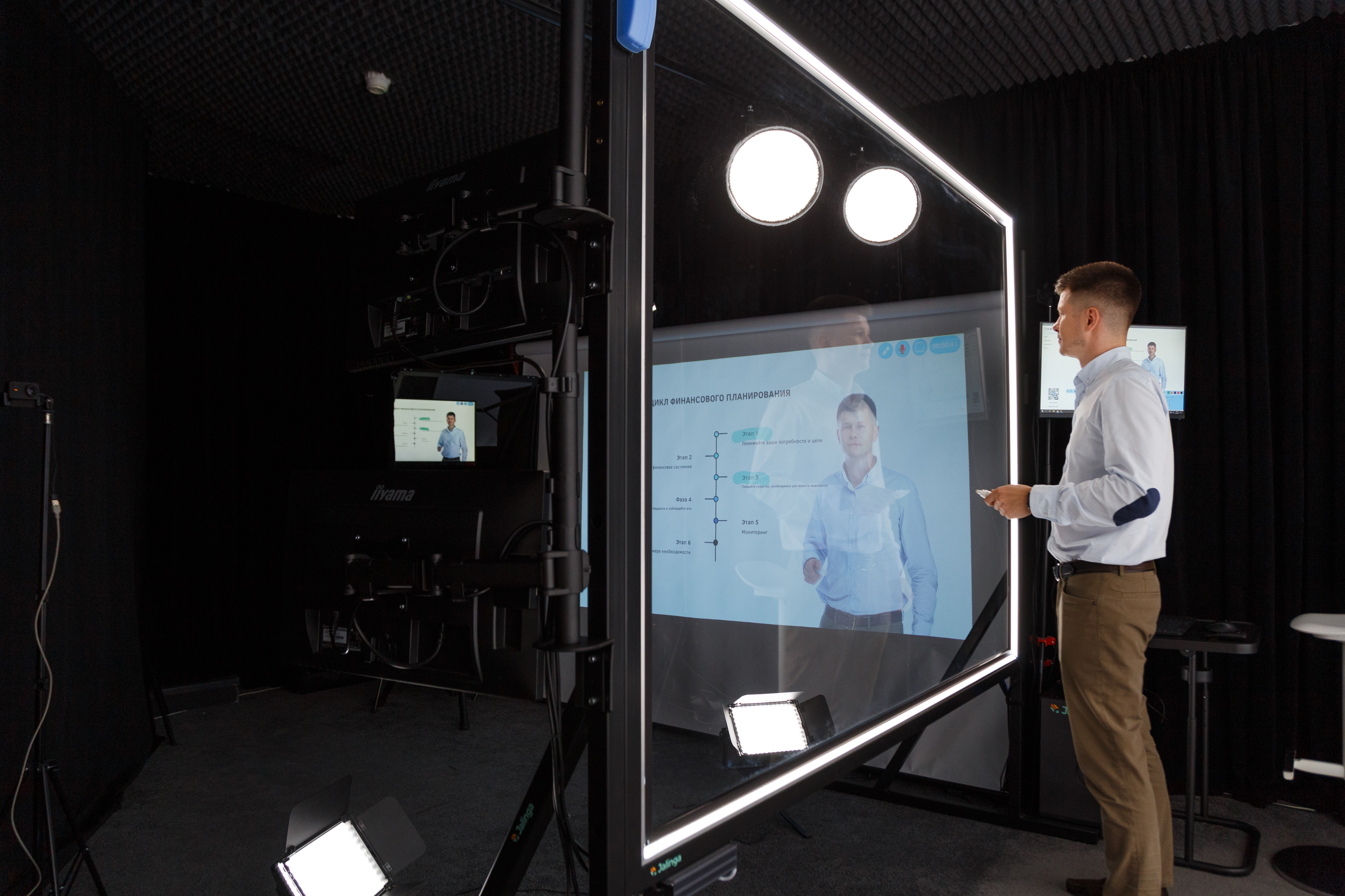 Программное обеспечение студии автоматизирует весь процесс записи: управление светом, телесуфлером и сценарием, настройка цветокоррекции под фон, а также запись видео в высоком качестве (до Full HD / 60 к/с). Контент готов сразу после записи — без этапа монтажа.
