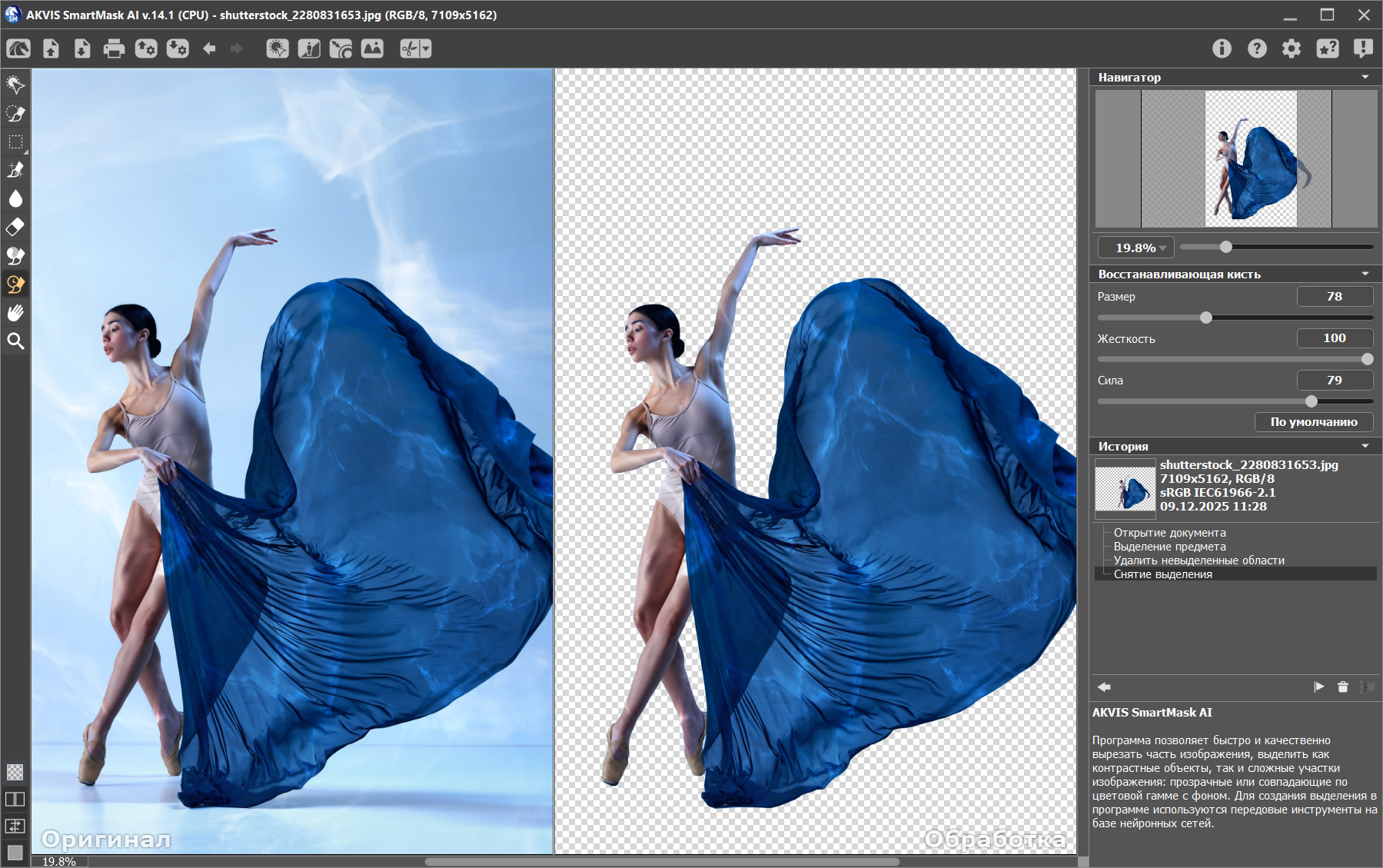 Программа от АКВИС "Удаление фона ИИ" - инструмент для быстрого и качественного выделения объектов на изображениях с использованием технологий искусственного интеллекта. Она упрощает процесс удаления фона, создания масок и работы с фрагментами изображений, что особенно полезно при создании фотомонтажей, ретуши и наложении эффектов на определённые участки.
